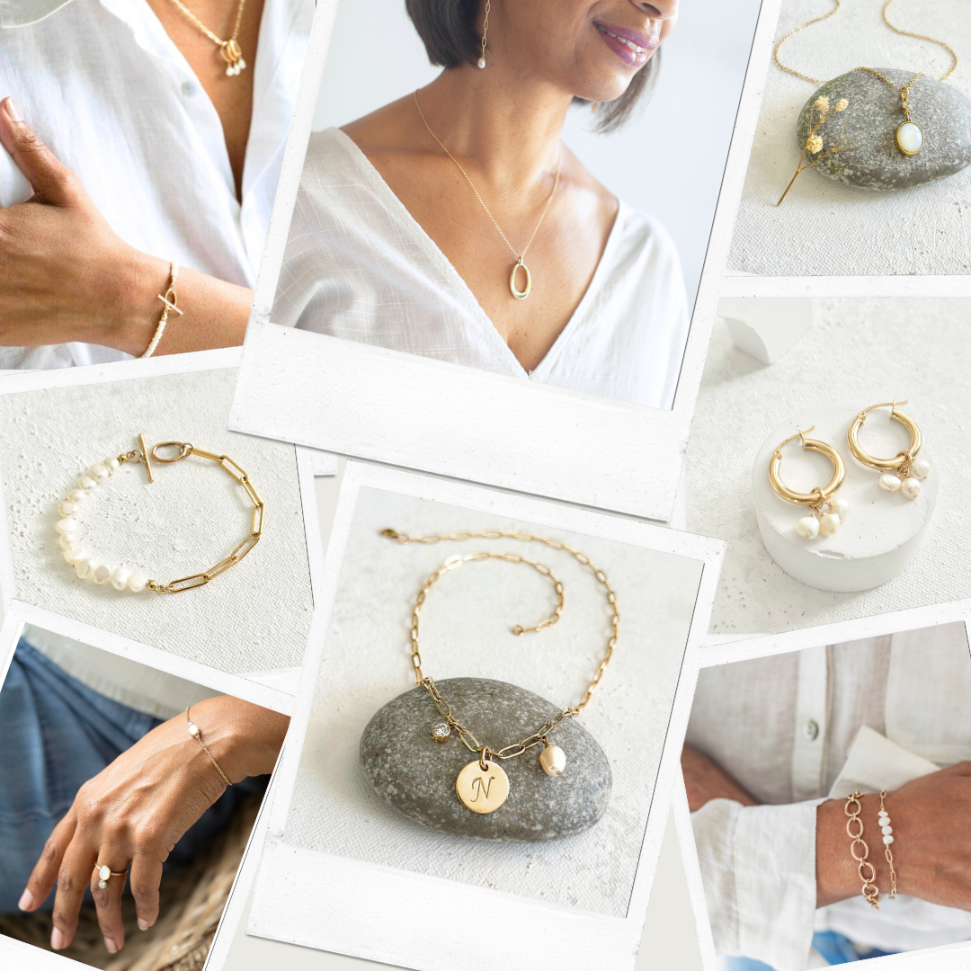The essence of pearls is expressed throughout from a mother of pearl pendant necklace, hoop earrings with drops of petite pearls to customized disc necklaces for personalization and diamonds accents for that hint of sparkle.