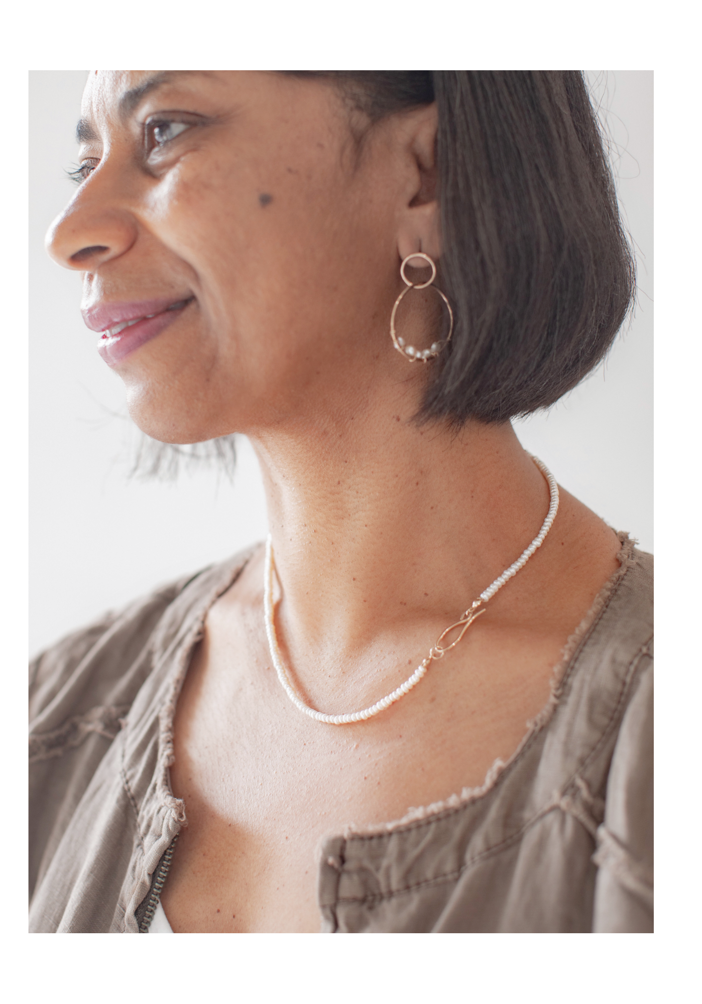 Seamless pearl necklace adorned with hook clasp for closure and hoop earrings with pearls wrapped along the edge.